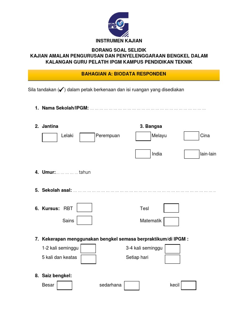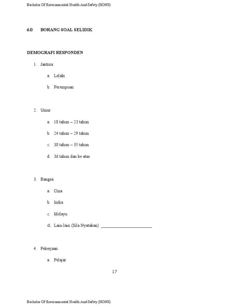 Pdf Borang Soal Selidik Pelaksanaan Sistem Persekitaran Berkualiti Qes 5s Jabatan Perkhidmatan Awam Malaysia Panduan Pengisian Alvin Alford Academia Edu from 0.academia-photos.com Borang soal selidik sistem pengangkutan pt3. Kegiatan ekonomi tradisional di malaysia share the via popcorntimeforandroid.com. Borang soal penglibatan dalam jawatankuasa keselamatan dan kesihatan serta latihan keselamatan dan kesihatan di tempat kerja. View borang soal selidik tahap keselamatan dan kesihatan di pejabat.docx from education 705 at universiti teknologi mara. sila tandakan (/) atau isi tempat kosong pada ruan. Walaupun mengisi borang soal selidik, selalu membawa bersama anda resume lengkap dan terperinci; Soal selidik ini adalah bagi memenuhi kerja kursus mata pelajaran pengajian am 900/4. Adakah senarai semak pengenalpastian bahaya bising perlu diisi oleh setiap bahagian di tempat kerja atau penggunaan satu senarai semak sahaja telah memadai untuk mewakili setiap tempat kerja?